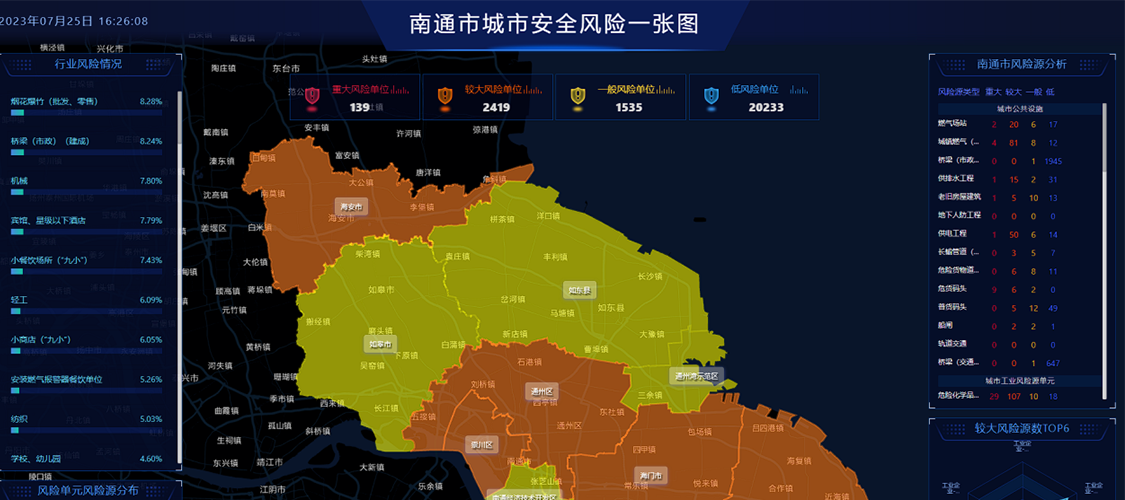 針對南通市3區、1縣和3縣級市全域開展風險辨識和評估,包括材料收集、走訪調查、建設城市風險平臺、線上填報、風險評估和現場復核等。
